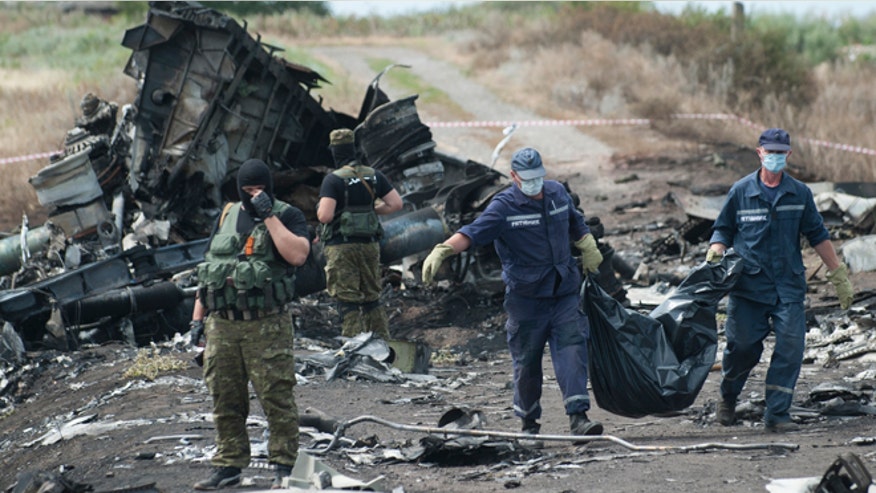 July 20, 2014: Ukrainian Emergency workers carry a stretcher with a victim's body in a bag as pro-Russian fighters stand in guard at the crash site of Malaysia Airlines Flight 17 near the village of Hrabove, eastern Ukraine.AP